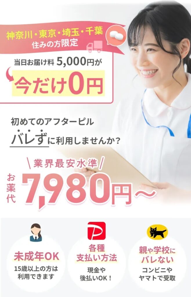 来院不要でコンビニで受け取れるため、バレずにアフターピルをゲットできるでしょう。