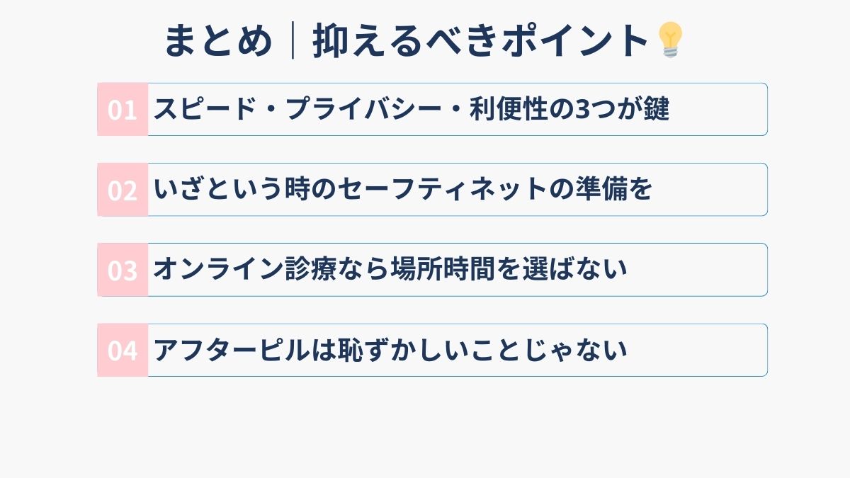 アフターピル処方を考える上で、スピード・プライバシー・利便性を考慮する必要があります。