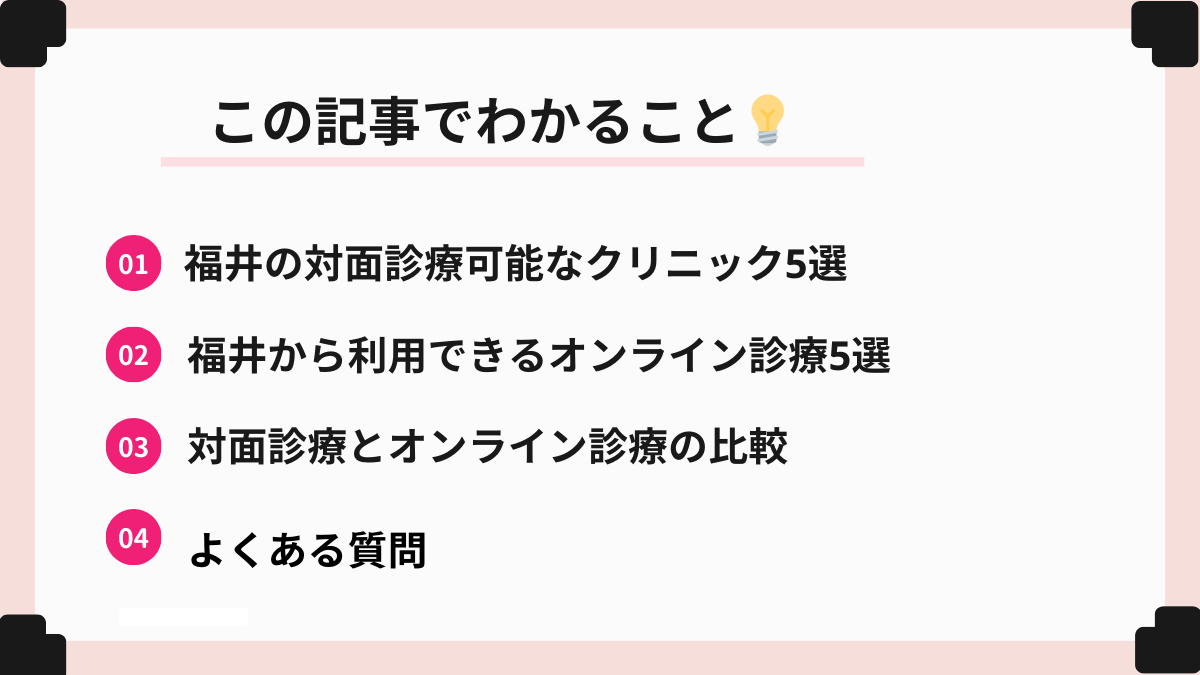 この記事では、福井県内で対面診療が受けられるクリニック5院と、24時間対応のオンラインクリニック5院を紹介します。