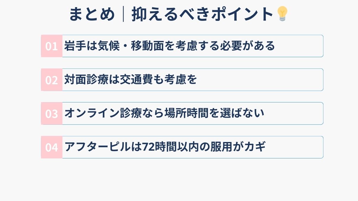 岩手県は「日本一広い県」だからこそ、「日本一オンライン診療が必要な県」でもあります。緊急避妊が必要になった時、地理的制約から諦める必要はもうありません。この記事が、岩手県のすべての女性が適切な医療を受けられる一助となることを願っています。