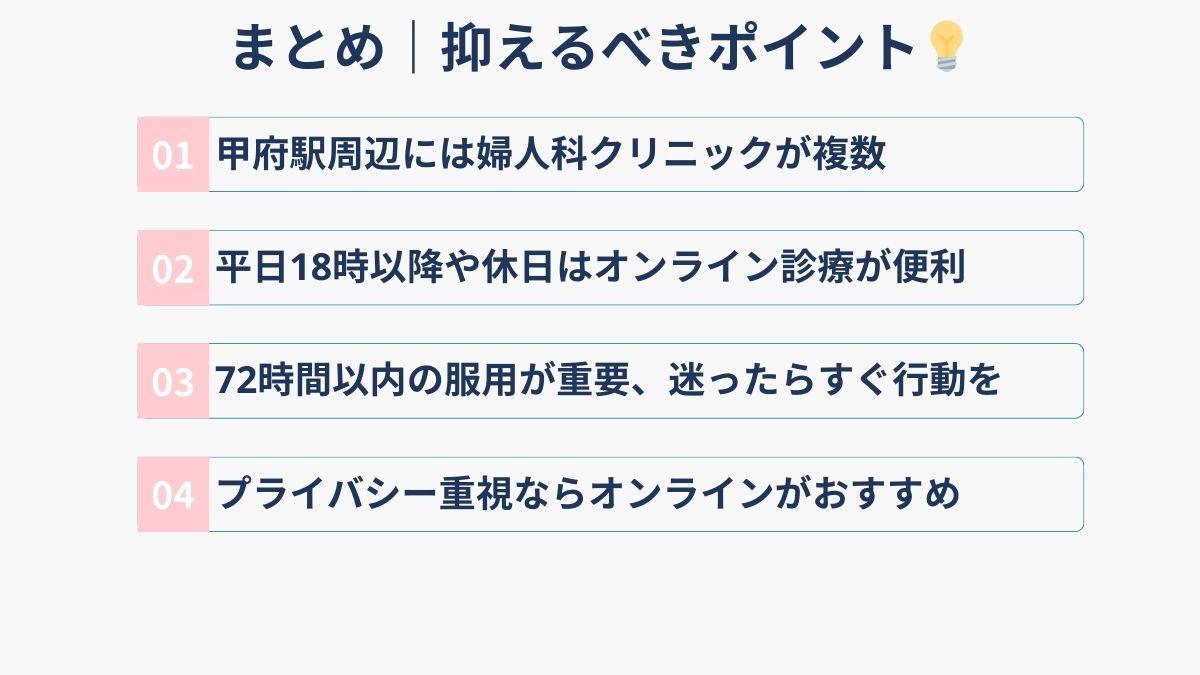 甲府市内には婦人科がいくつかありますが、夜間や休日に対応できるクリニックは限られています。特に緊急を要するアフターピルの処方となると、すぐに受診できる場所を見つけるのは簡単ではありません。