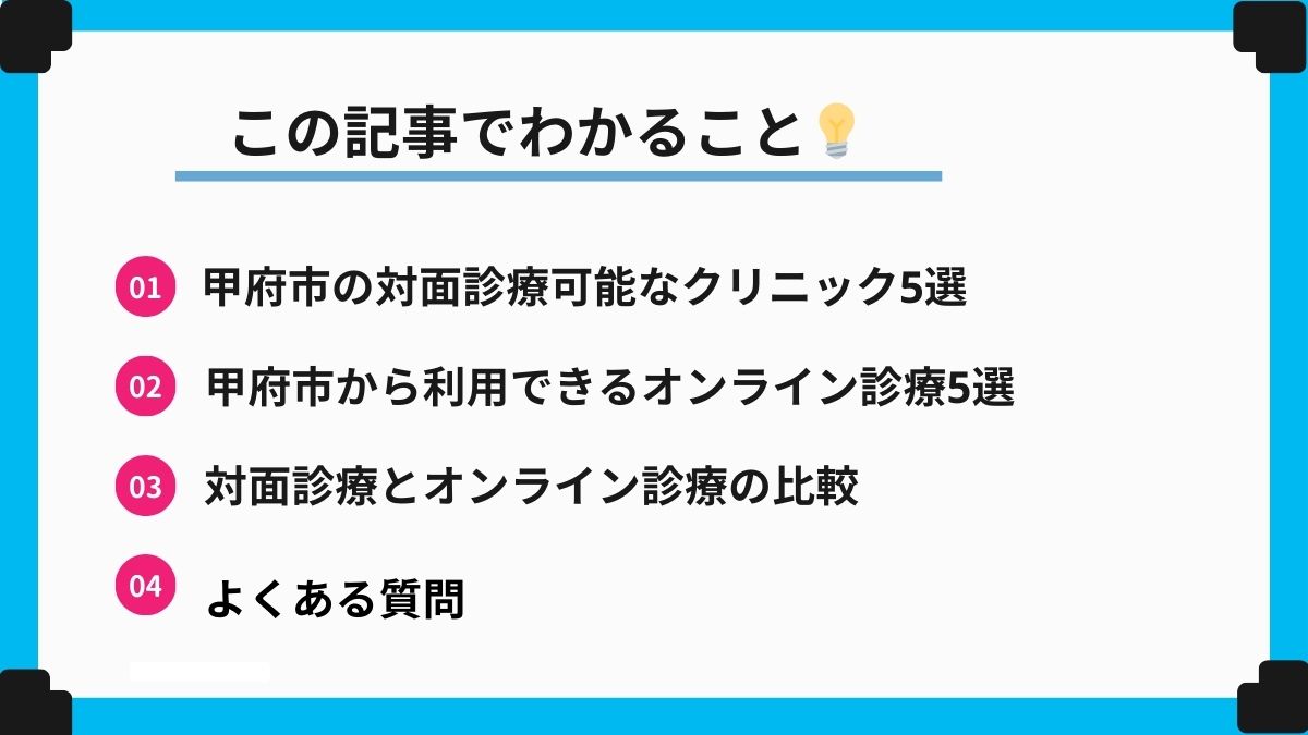 この記事では、甲府市内で対面診療が受けられるクリニック5院と、24時間対応のオンラインクリニック5院を厳選してご紹介します。