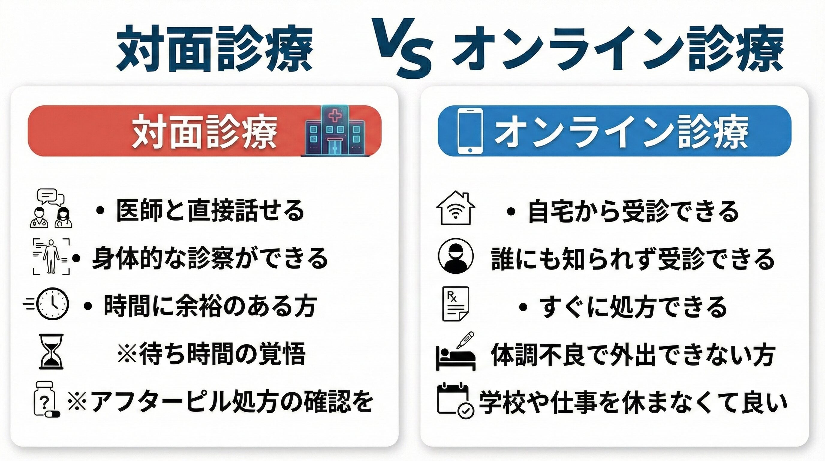 「72時間のタイムリミットが迫っている」「深夜で不安」「誰にも会いたくない」という方には、オンライン診療が最適です。