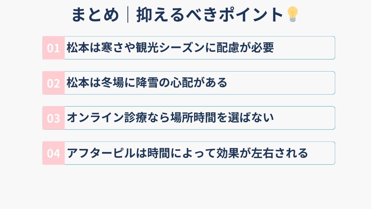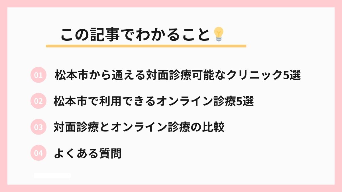 本記事では、松本市内で受診できる対面クリニック5選と、24時間365日対応可能なオンラインクリニック5選を解説します。料金体系、診療時間、アクセス方法、予約手順まで、今すぐ必要な情報を網羅しています。