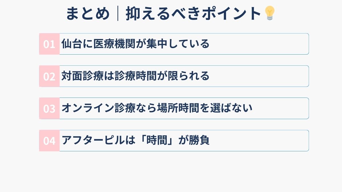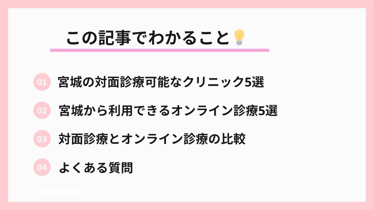 この記事では、仙台市青葉区・宮城野区を中心とした信頼できる対面診療クリニック5選と、県内全域から利用できる24時間対応のオンラインクリニック5選を厳選してご紹介。特にパーソナルケアクリニックは、LINEで最短5分診察、女性医師選択可能、これまで数千件の処方実績を持つ、宮城県民に最も選ばれているオンライン診療サービスです。