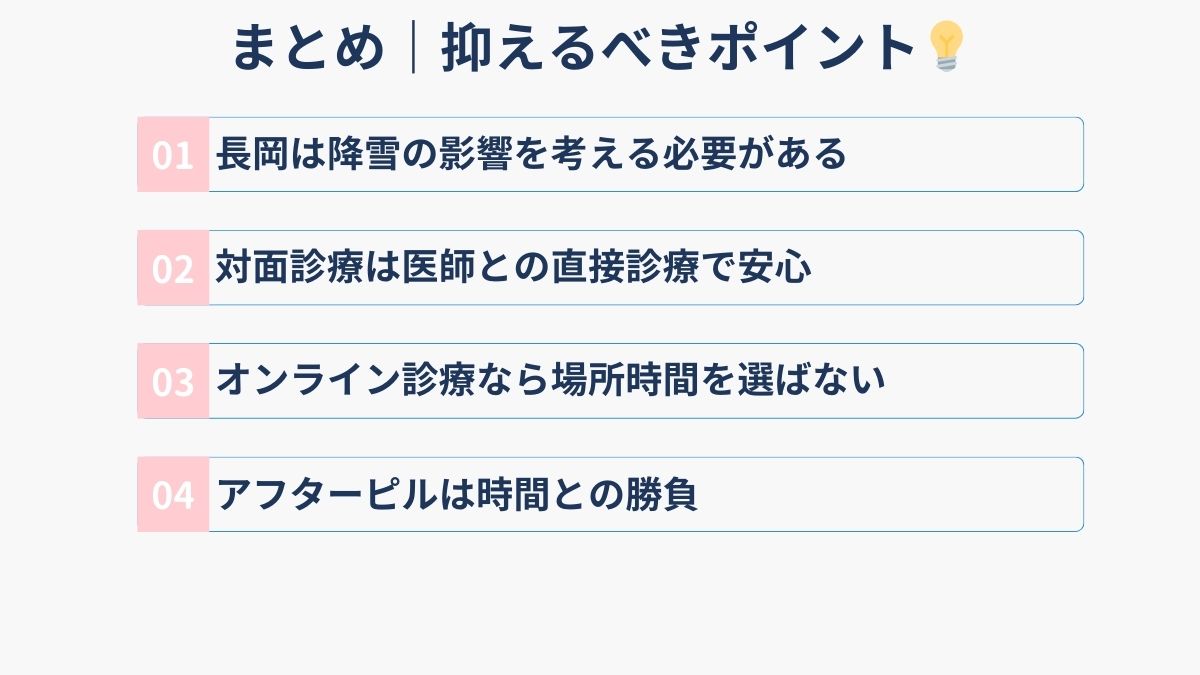 長岡市でアフターピルを入手する方法として、対面診療とオンライン診療があります。長岡市は新潟県でも特に降雪量が多い地域。冬季の移動困難や夜間・休日の緊急時には、オンライン診療が便利です。