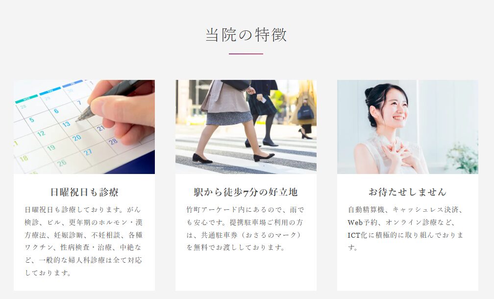 婦人科診療の中で緊急避妊(アフターピル)の相談にも対応しており、アクセスの良さから急ぎの受診もしやすい点が特徴です。