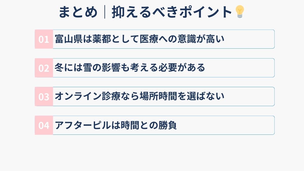 富山県は「薬都」として医療への意識が高い地域ですが、地理的な広がりや冬季の降雪、県東部・南部での医療機関の限られた選択肢を考えると、オンライン診療が便利です。
