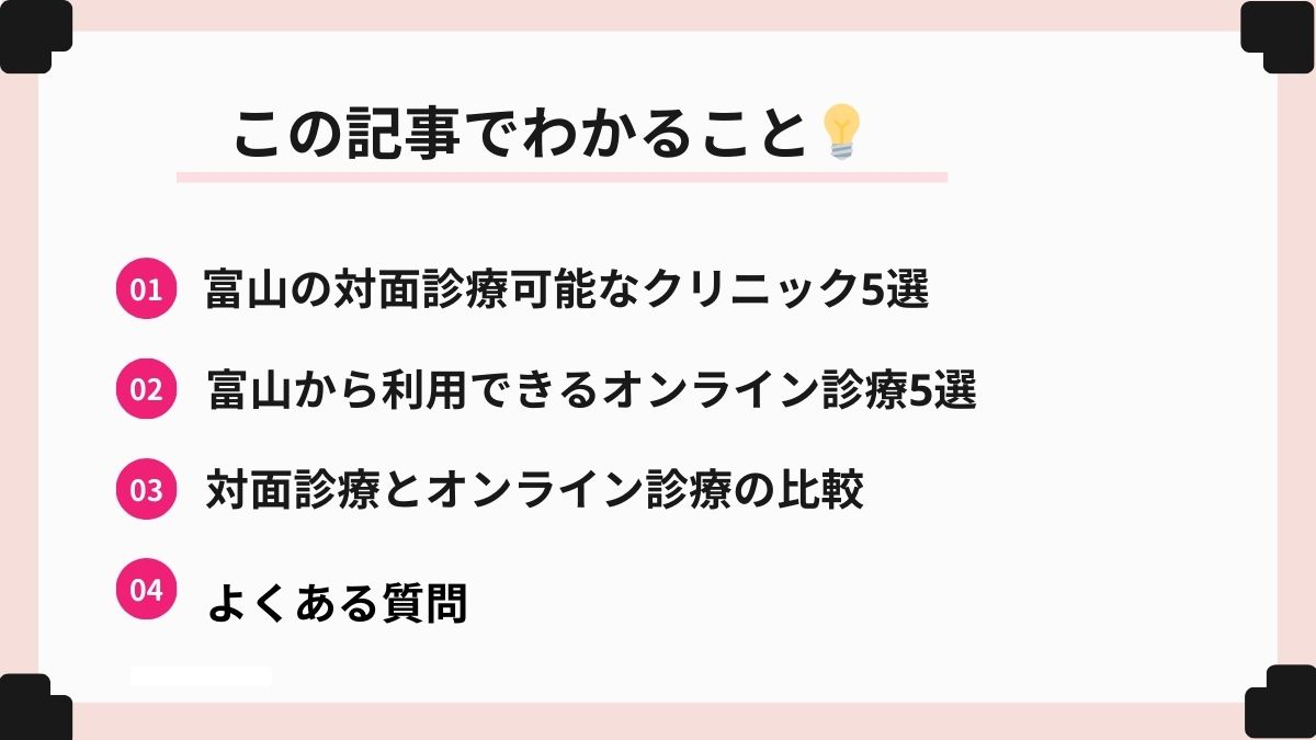 この記事では、富山県内で受診できる対面クリニック5選と、24時間365日対応可能なオンラインクリニック5選を解説します。料金、診療時間、アクセスなど、今すぐ知りたい情報を紹介します。