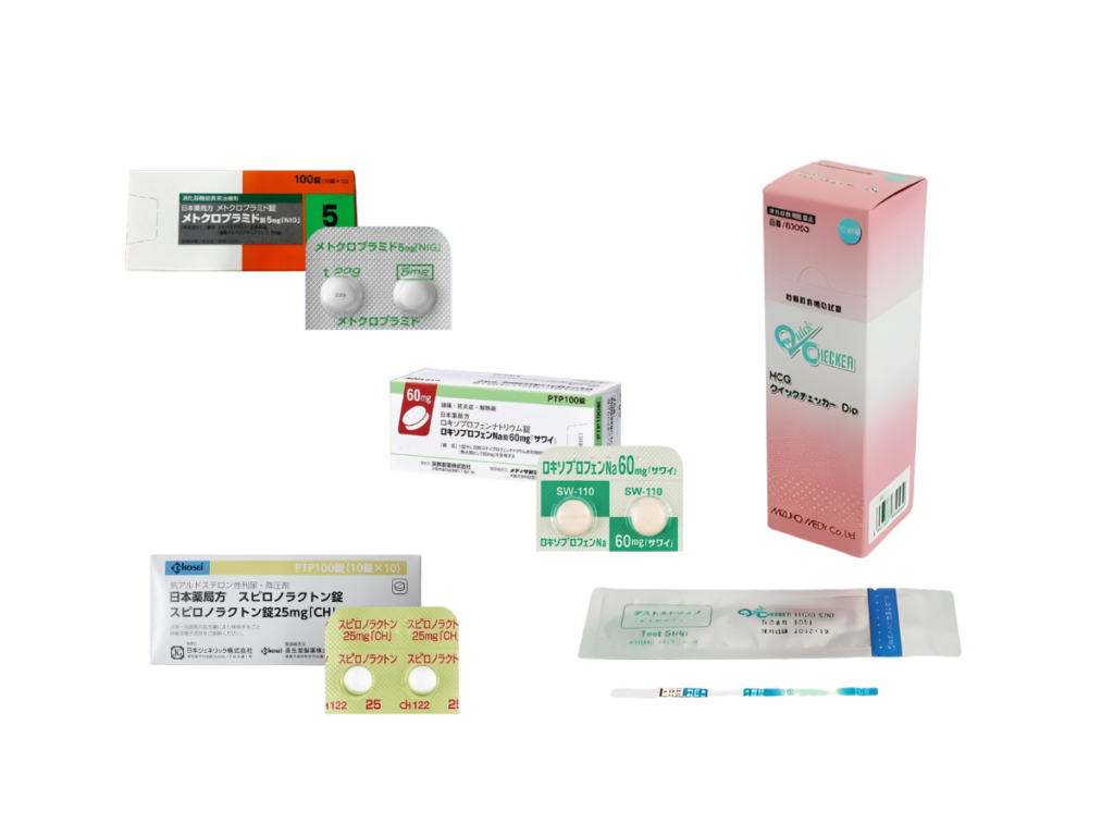 アフターピル利用後、「最速で使える」妊娠検査薬1回分と吐き気止めと痛み止め、むくみ止めの各2錠のセットです。