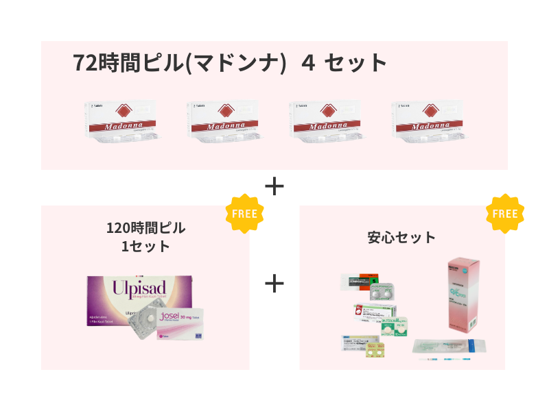 マドンナの場合は、2錠分で1回分の効果となります。行為時間の24時間以内に1錠、内服の12時間後に1錠を内服します。初回内服が行為日時の24~72時間の場合は2錠同時に内服となります。